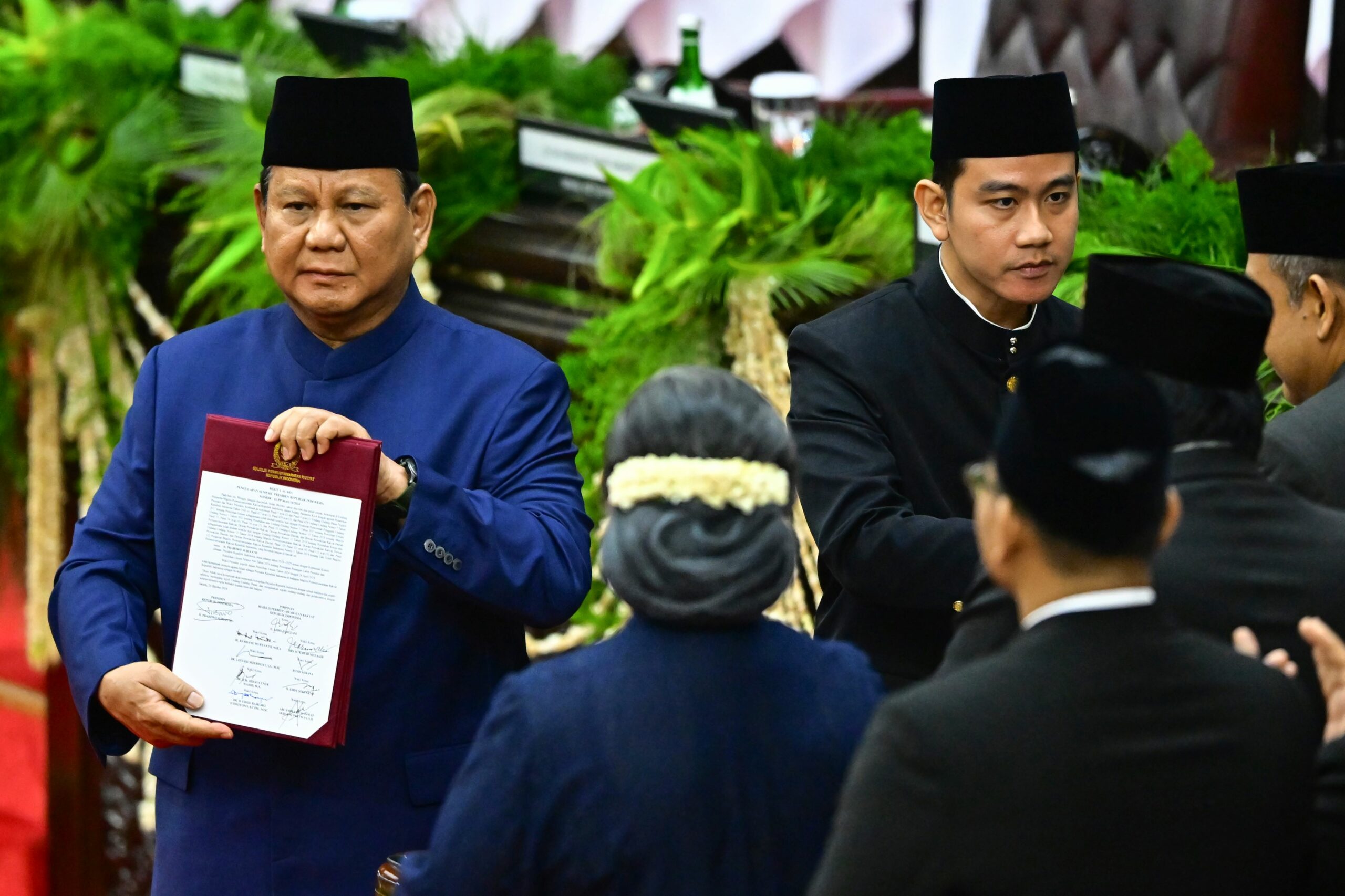 Setelah pengucapan sumpah, Prabowo dan Gibran menandatangani berita acara pelantikan yang disaksikan oleh pimpinan MPR RI. Mereka kemudian bertukar tempat duduk dengan Joko Widodo dan Ma’ruf Amin, sebagai simbol peralihan kepemimpinan. Acara berlanjut dengan pidato perdana Prabowo sebagai Presiden Republik Indonesia.