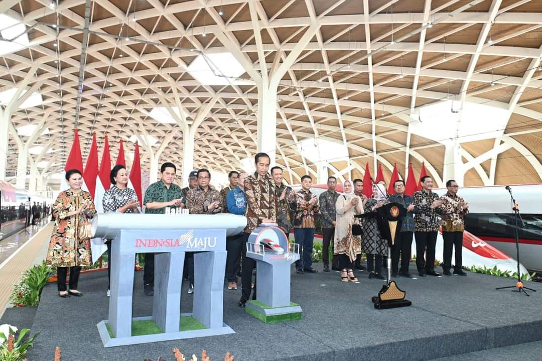 Langgam.id – Presiden Joko Widodo didampingi Ibu Iriana Joko Widodo meresmikan Kereta Cepat Jakarta-Bandung (KCJB) di Stasiun Halim, Jakarta, pada Senin, 2 Oktober 2023. Kereta dengan kecepatan 350 kilometer per jam yang diberi nama WHOOSH tersebut merupakan kereta cepat pertama di Indonesia dan juga Asia Tenggara.