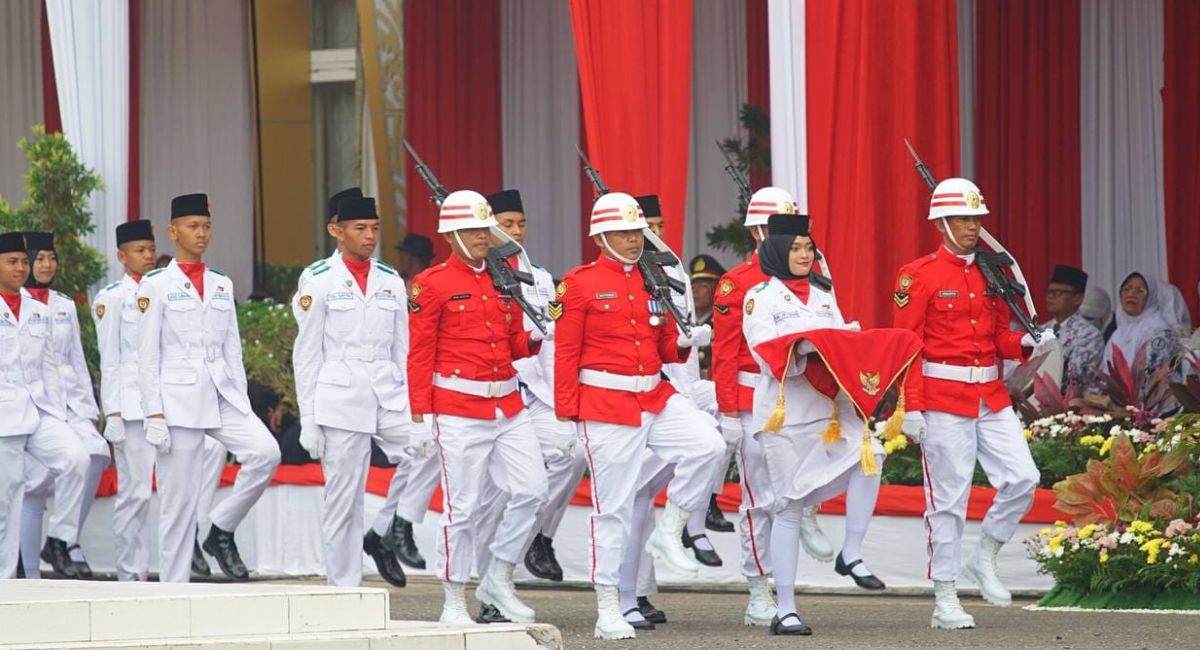 Derap langkah Paskibraka menuju lapangan upacara menjadi momen yang paling ditunggu. Inspektur upacara menyerahkan duplikat Sang Saka Merah Putih kepada Paskibraka untuk dikibarkan.
