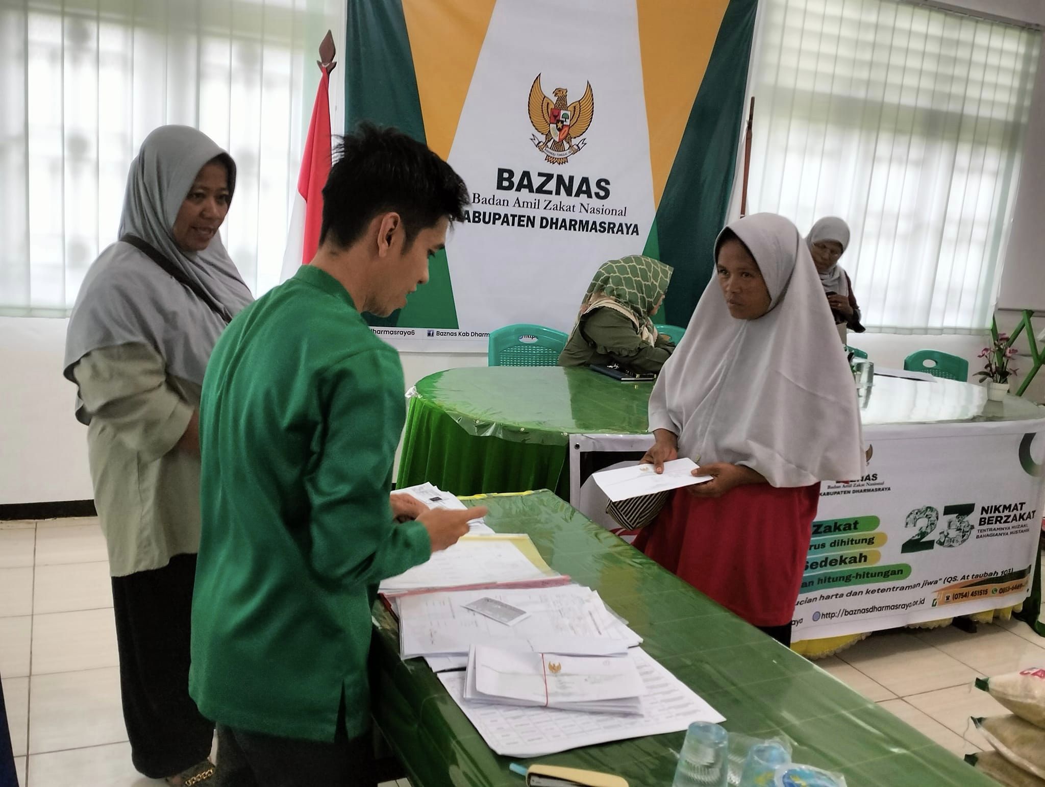 Penyerahan bantuan tersebut dilakukan di kantor Baznas Kabupaten Dharmasraya. Bantuan ini diserahkan oleh pimpinan Baznas didampingi Amil pelaksana.