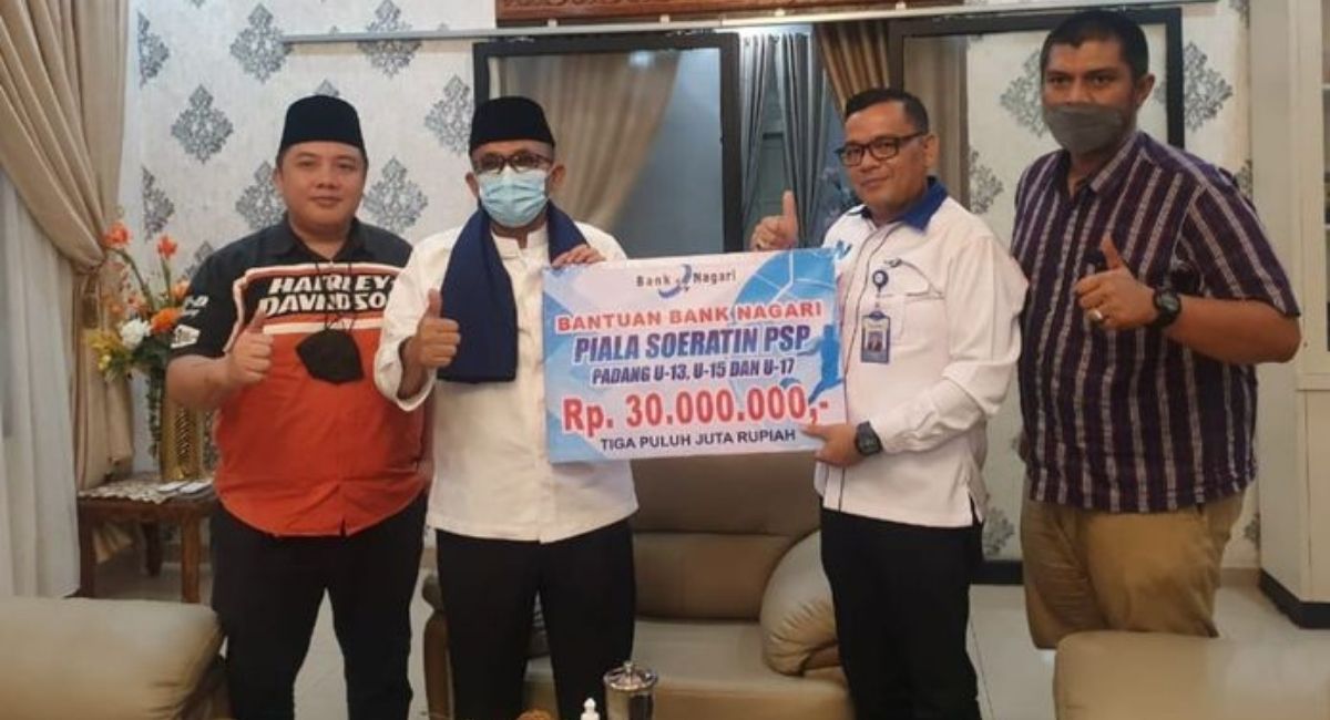 PSP Padang menerima bantuan sebesar Rp 30 juta yang diserahkan oleh Pimpinan Bank Nagari Cabang Pasar Raya Padang Syafrizal CH di rumah dinas Wali Kota Padang, Selasa (1/3/2022).