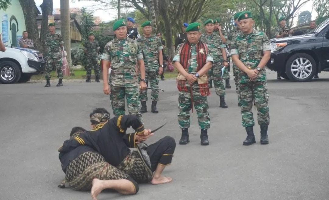 Dandim 0319/Mentawai Letkol Inf Suirwan bersama unsur Forkopimda menyambut rombongan Pangdam dan Danrem dengan Tari Turuk Langgai, tarian khas Suku Mentawai.