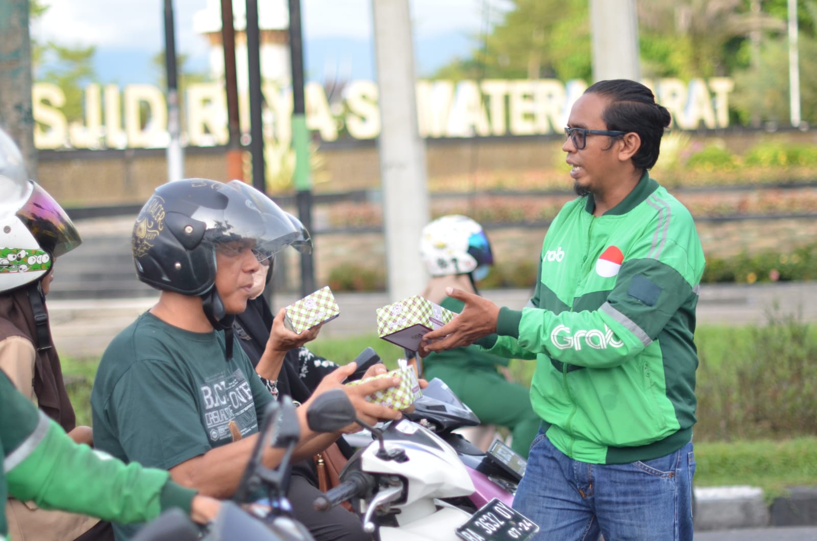 Salah seorang Mitra Grab yang membagikan takjil kepada sesama pengemudi ojek online