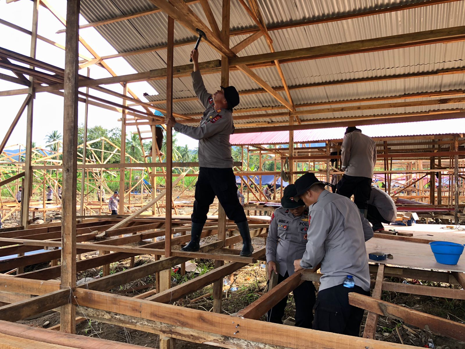 Kegiatan ini dipimpin langsung oleh Wadanyon A Pelopor AKP Dasrinal dengan fokus pada pemasangan atap, lantai, dan kerangka bangunan.