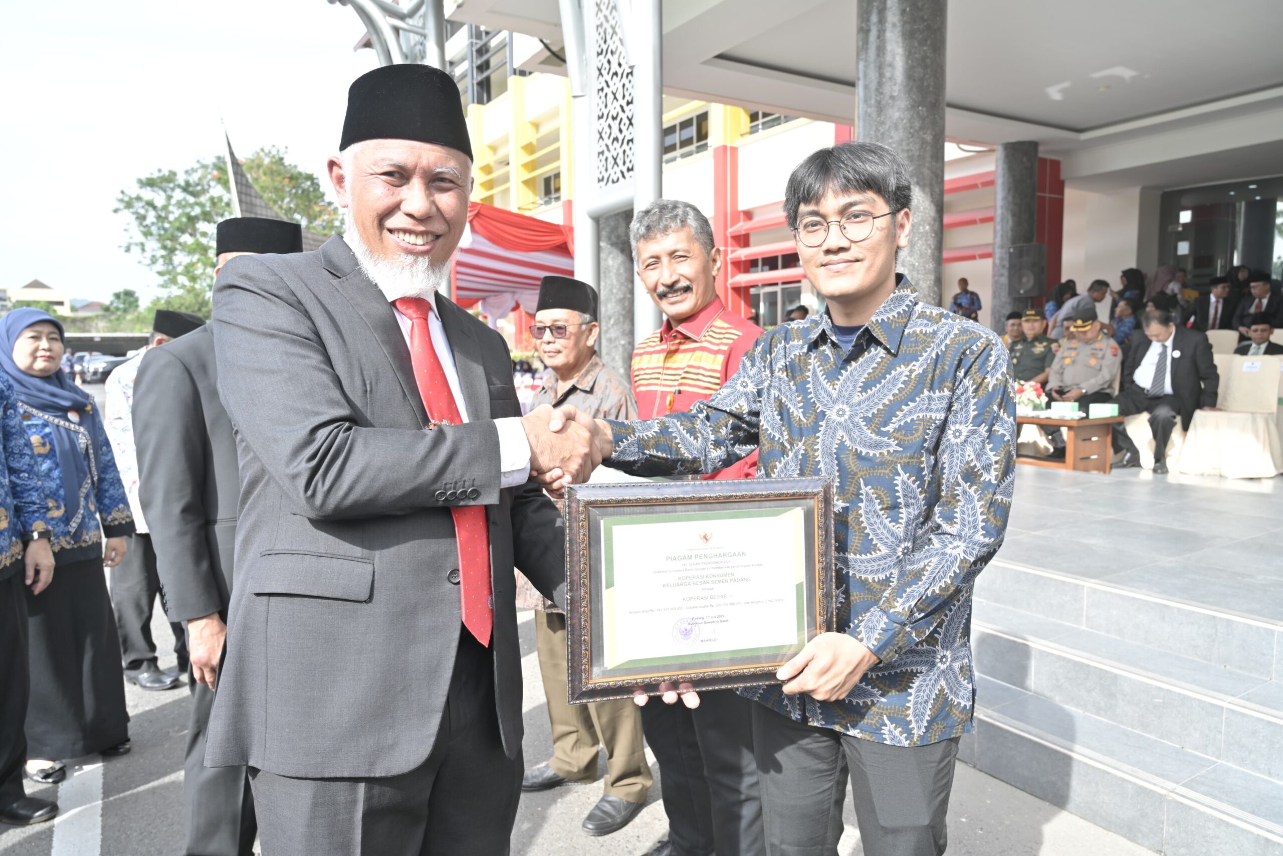 Penghargaan dari Pemerintah Provinsi Sumbar diserahkan langsung oleh Gubernur Mahyeldi kepada Bendahara Pengurus KKSP, Febby Arief Zeindra, seusai upacara Hari Koperasi tingkat provinsi di Kantor Gubernur, Kamis (17/7).