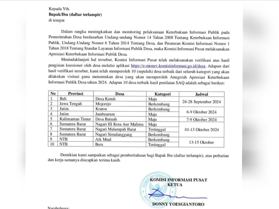 Komisi Informasi Pusat mengumumkan hasil penilaian tersebut dalam surat nomor 846/KIP/IX/2024, yang memuat daftar desa terbaik dalam kategori Desa Maju, Berkembang, dan Tertinggal.