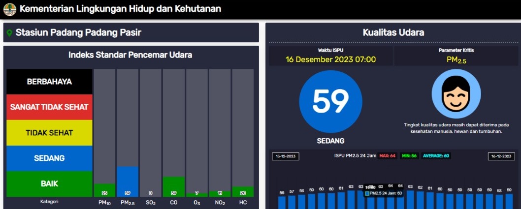 Berdasarkan Indeks Standar Pencemar Udara (ISPU) melalui Peralatan Air Quality Monitoring System (AQMS) di Padang Pasir, Kota Padang, pada Sabtu (16/12/2023) pukul 06.00 WIB, kualitas udara di daerah itu bernilai 59. Angka ini memang naik lima poin dari hari sebelumnya.