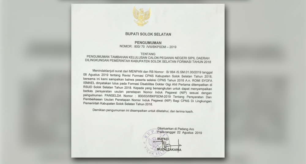 Kelulusan dokter yang sempat viral di media sosial (medsos) ini, tertera dalam surat pengumuman nomor 800/70/VIII/BKPSDM-2019 tentang pengumuman tambahan kelulusan CPNS daerah di lingkungan Pemerintah Kabupaten Solok Selatan Formasi Tahun 2018.