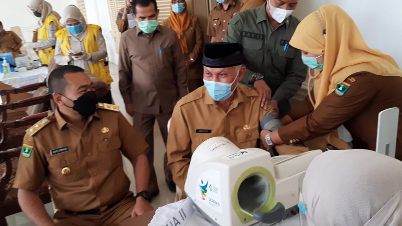Langgam.id – Penyuntikan vaksin covid-19 dilakukan untuk Aparatur sipil negara (ASN) di lingkungan Pemprov Sumatra Barat (Sumbar). Vaksinasi massal tahap pertama dilakukan kepada kepala OPD di lingkungan Pemprov Sumbar di Auditorium Gubernuran Sumbar, Senin (8/3/2021).