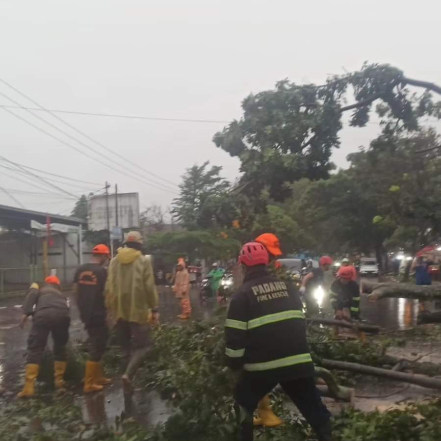Antisipasi gangguan kemacetan, personil Satuan Perlindungan Masyarakat (Satlinmas) Kota Padang beserta unsur kebencanaan lainnya melakukan evakuasi pohon yang tumbang tersebut.