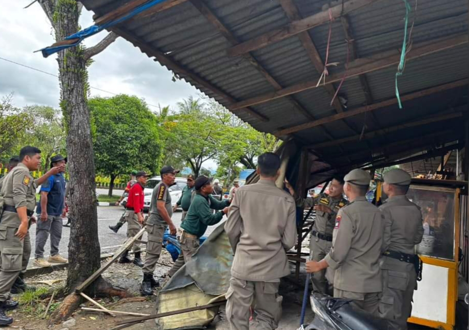 Dalam penertiban Personil Pol PP terpaksa bongkar sepuluh lapak yang masih berdiri di atas fasum, dan personil amankan barang-barang milik PKL berupa meja, kursi, terpal, gerobak dan seng sebagai barang bukti.
