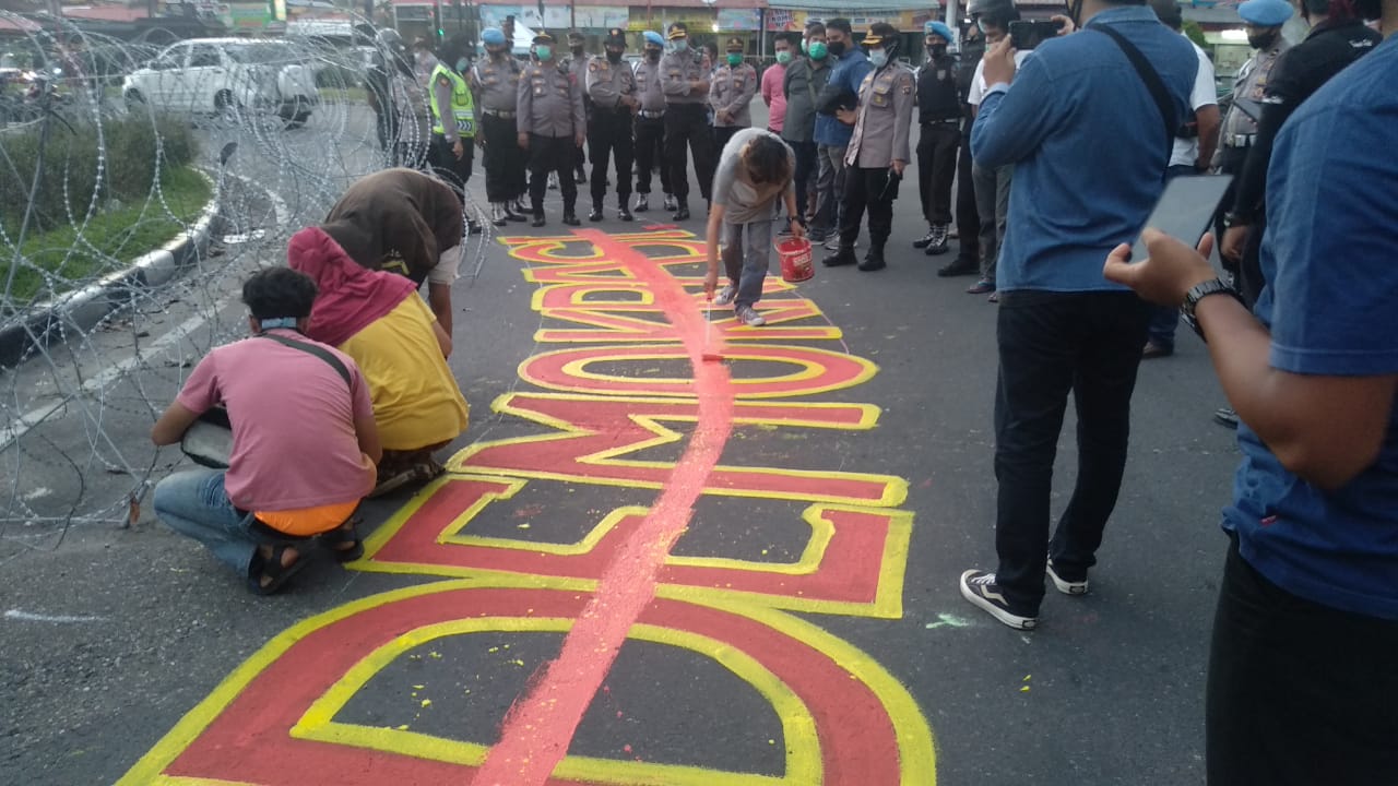 Mahasiswa ini mengunakan cat dan menuliskan aspirasi mereka di badan jalan. Coretan yang mereka tulis rencananya berupa kalimat “demokrasi tanpa penindasan”.