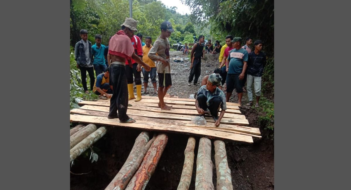 Masyarakat gotong royong membuat jembatan darurat menggunakan balok kayu yang diambil menggunakan gegaji mesin (chainsaw) di sekitar lokasi. Jembatan darurat dibangun sembari berharap datangnya bantuan dari pihak provinsi maupun kabupaten.