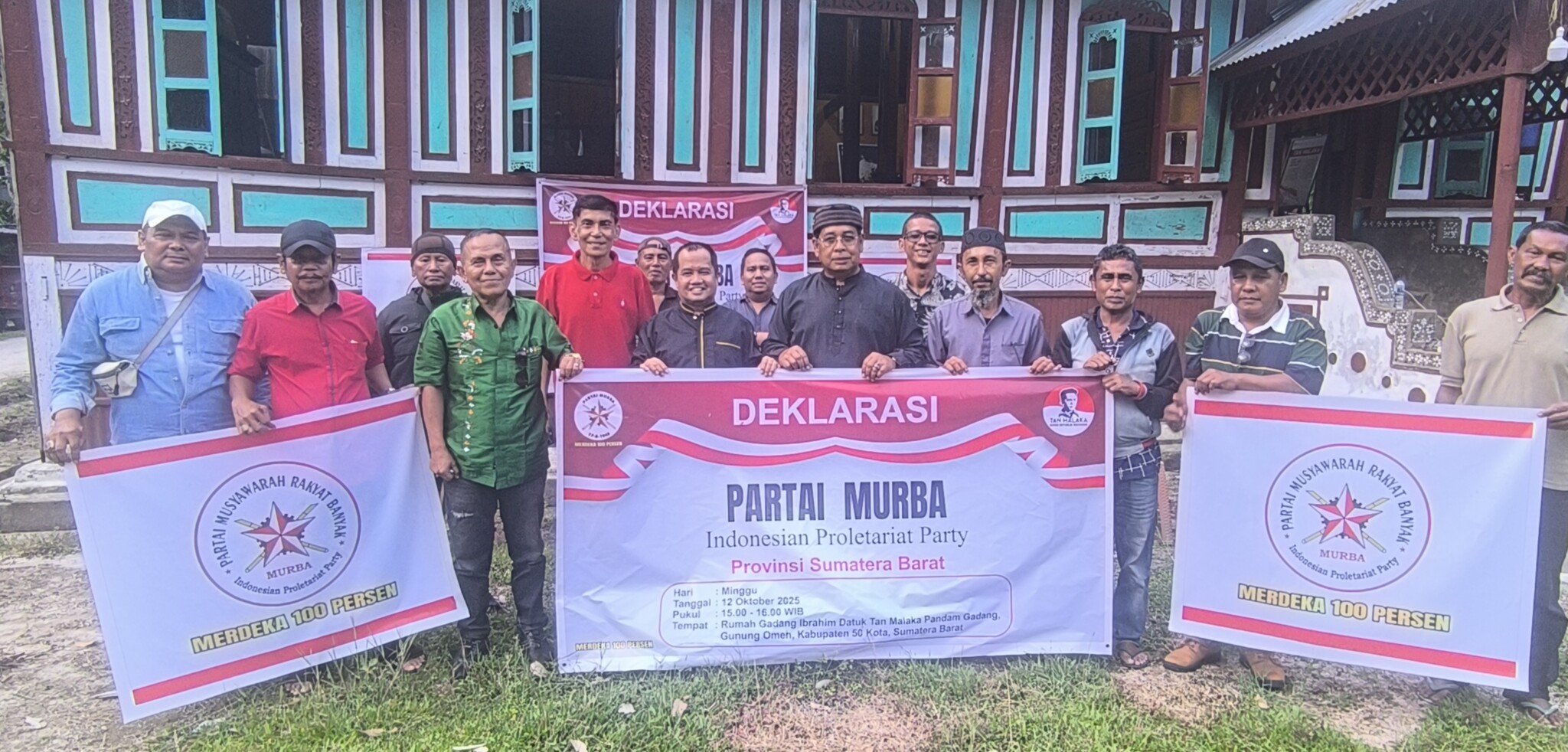 Spanduk besar bertuliskan “Partai Murba – Indonesian Proletariat Party” dan slogan “Merdeka 100 Persen” menghiasi halaman rumah bersejarah itu, menegaskan arah perjuangan partai yang berpihak pada rakyat kecil.