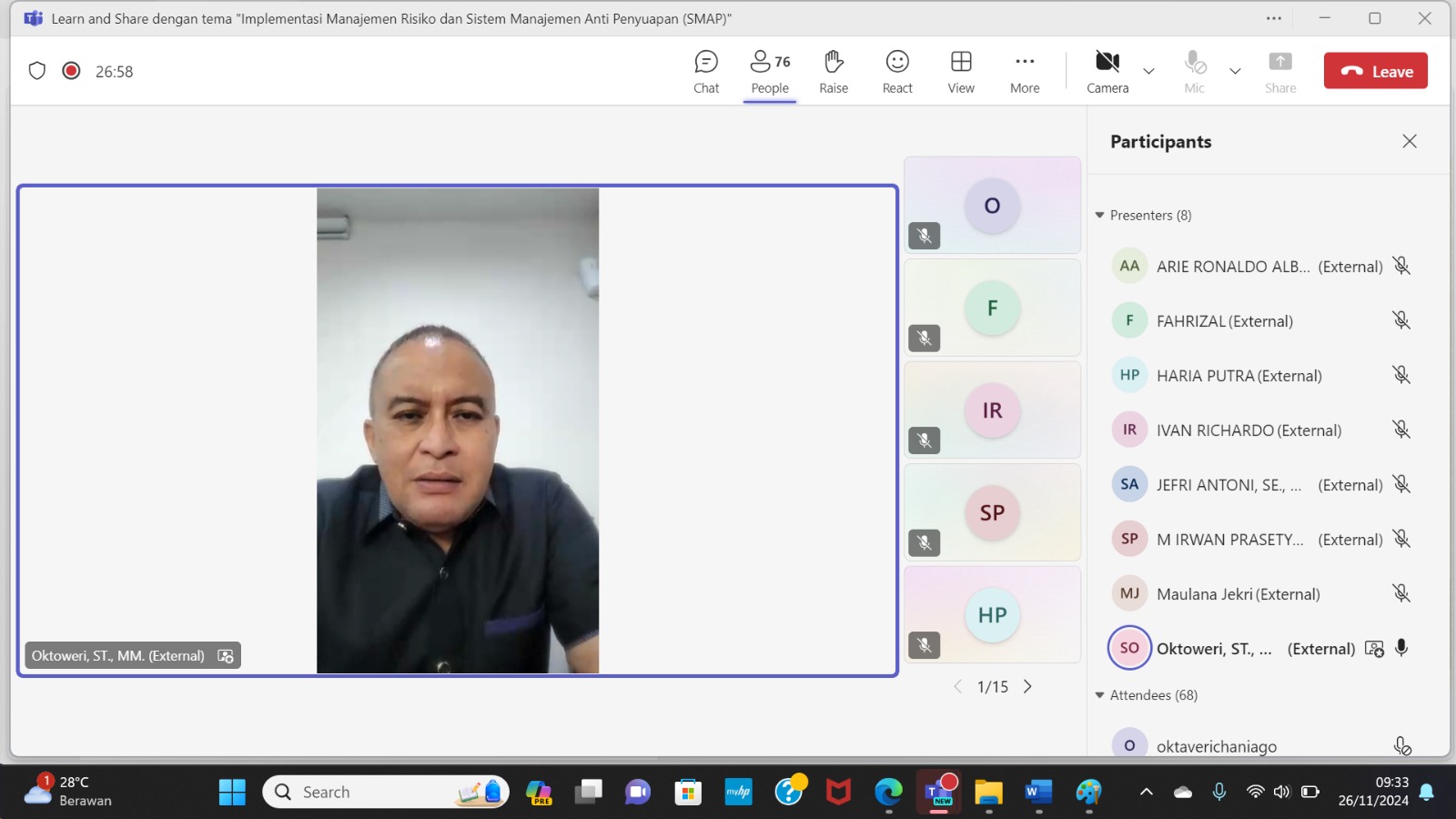 “Kegiatan ini menunjukkan komitmen kita terhadap pelaksanaan di SMAP berbasis ISO 37001 dan juga Manajemen Risiko 31000. Kita mengadakan ini bukan hanya comply kepada sistemnya tetapi untuk lebih mengingatkan kita semua pentingnya menerapkan dan mengevaluasi kegiatan mitigasi resiko menjadi tanggung jawab di dalam Sistem Manajemen Risiko dan SMAP,” katanya.