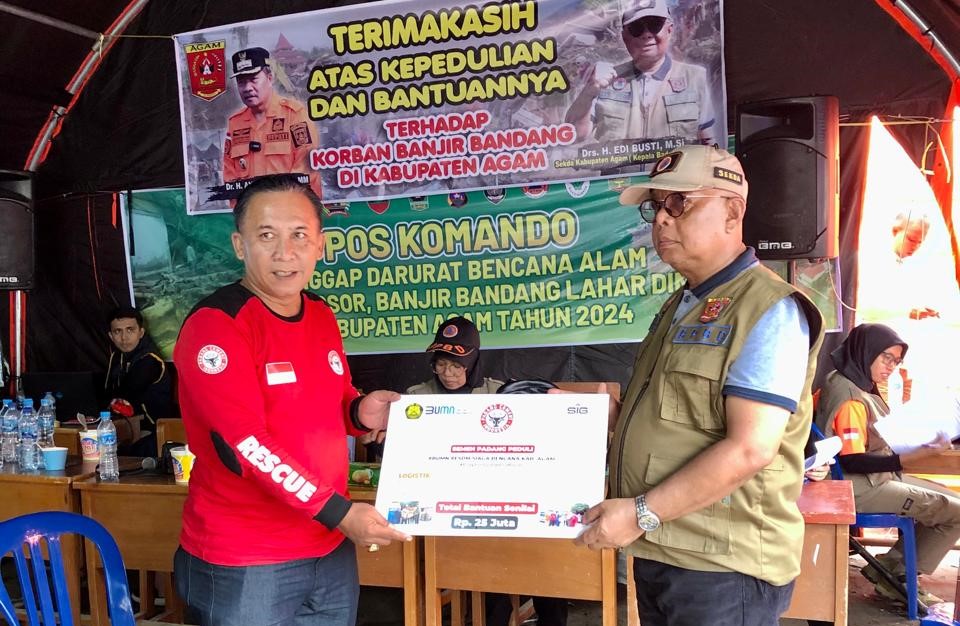 Bertempat di Posko Bukik Batabuah, Kecamatan Canduang, Kabupaten Agam, bantuan logistik itu diserahkan oleh Staf Program TJSL BUMN PT Semen Padang Edi Fahrizal, kepada Sekretaris Daerah Kabupaten (Sekdakab) Agam Edi Busti.