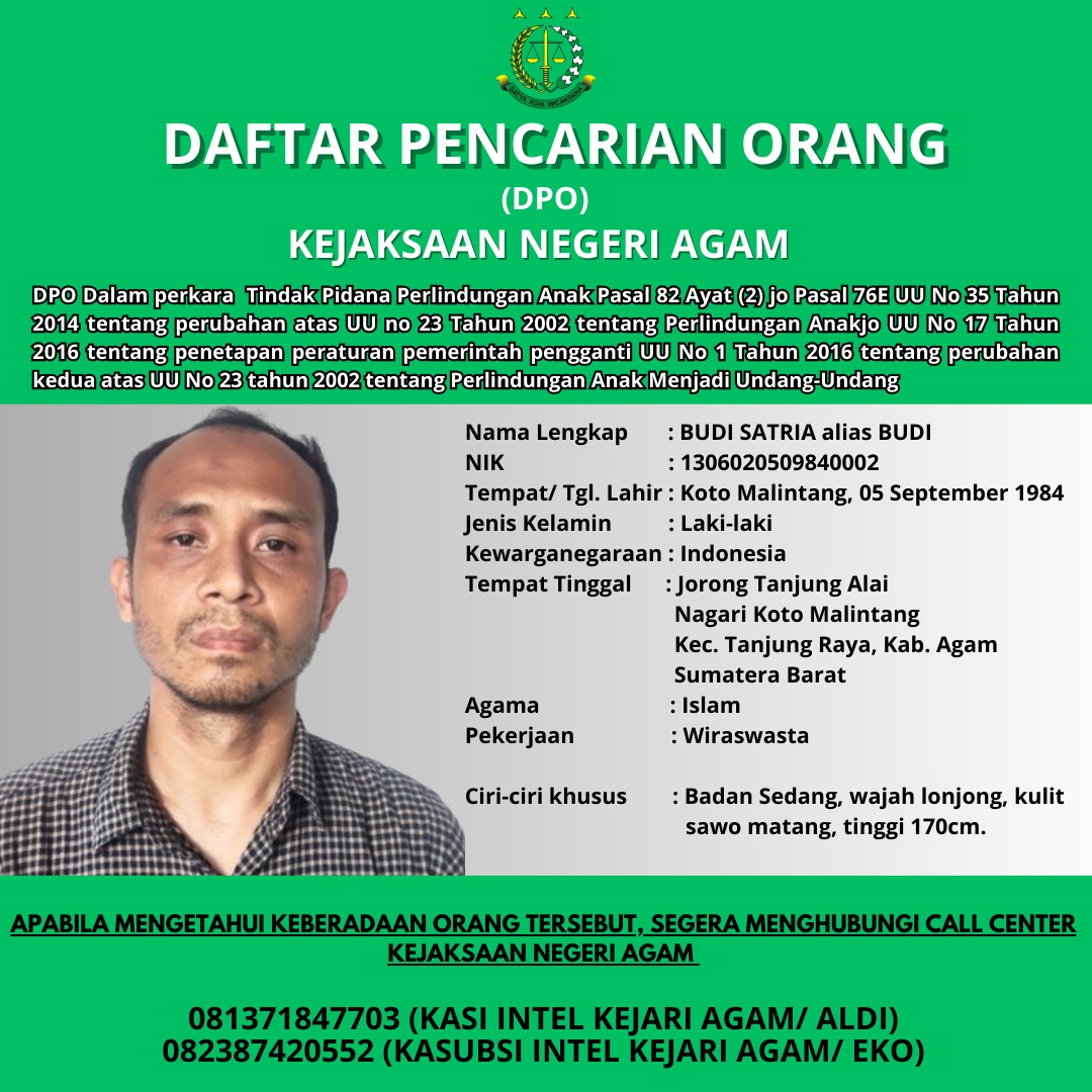 Kejaksaan Negeri Agam telah memasukkan Budi sebagai daftar pencarian orang (DPO). Informasinya, terpidana perkara tindak pidana perlindungan anak ini telah DPO Seksi Pidana Umum Kejaksaan Negeri Agam sejak awal 2024.