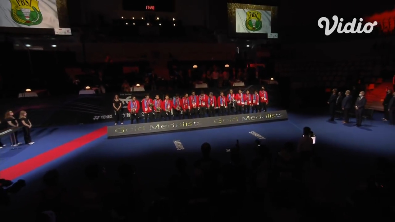 Penyerahan Thomas Cup dilangsungkan setelah masing-masing pemain dikalungkan medali. Lagu Kebangsaan Indonesia Raya kemudian berkumandang. Sayangnya, selebrasi kemanangan kali ini tanpa kibaran Sang Merah Putih, buntut sanksi yang diberikan Badan Anti Doping Dunia (WADA) terhadap Indonesia.