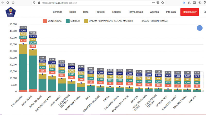 Berikut sebaran kasus Covid-19 di Indonesia tiap provinsi berdasar jumlah kasus, sesuai data situs covid-19.go.id:
