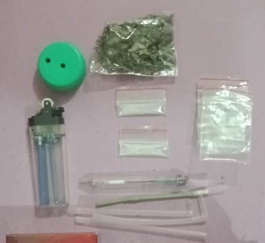 Dua paket sabu ukuran kecil ditemukan berada dalam saku-saku celana tersangka. Selain itu, petugas juga menemukan satu paket ganja di dalam kamar kos pelaku plus alat hisap sabu.