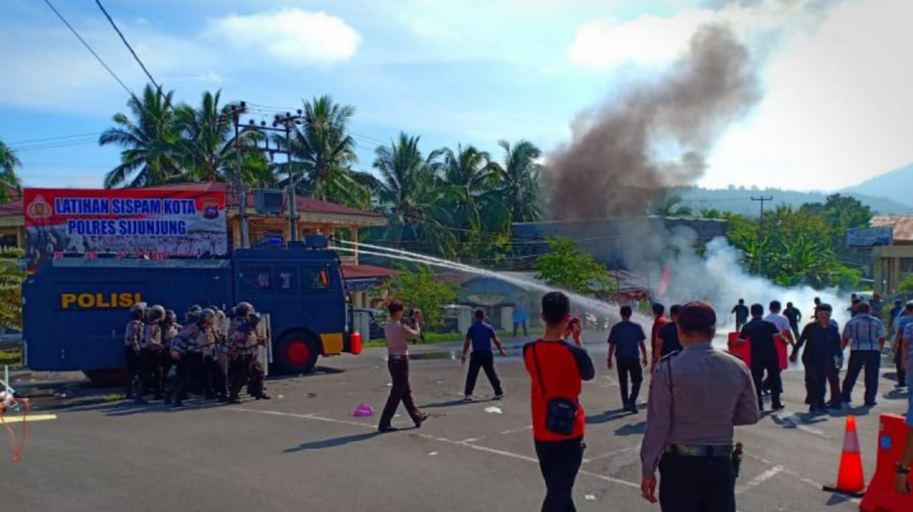 Terlihat, personil dari Dalmas Satsamapta Polres Sijunjung langsung diterjunkan menghadang massa yang hendak melakukan anarkis tersebut. Selain itu, mobil kendaraan taktis Polri AWC (Armoured Water Cannon) pun ikut membantu mengurai massa.
