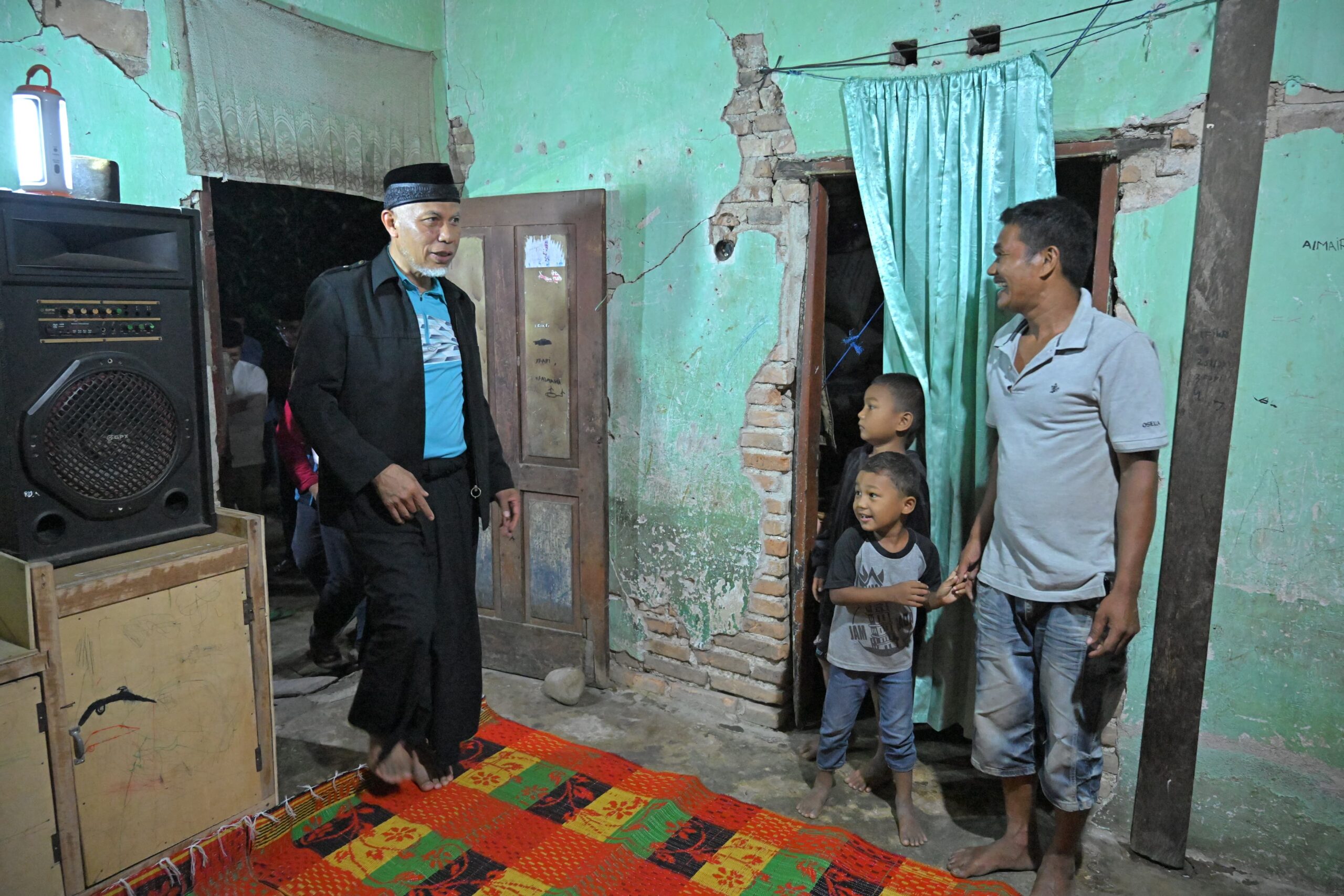 “Setelah kita lihat, rumah yang ditempati Agus ini tidak memiliki besi tiang. Ini sangat berisiko sekali ketika ada gempa. Rumah ini layak dibantu dan harus segera direhab kembali agar lebih kuat, sehingga anak dan istri lebih aman nyaman tinggal di dalamnya,” ucap Mahyeldi lagi.