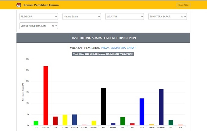 Masih ada 97,03 persen TPS lagi yang menunggu dimasukkan, untuk perolehan yang sebenarnya. Dari 19 kabupaten dan kota di Sumbar, suara baru masuk dari 12 kabupaten dan kota.