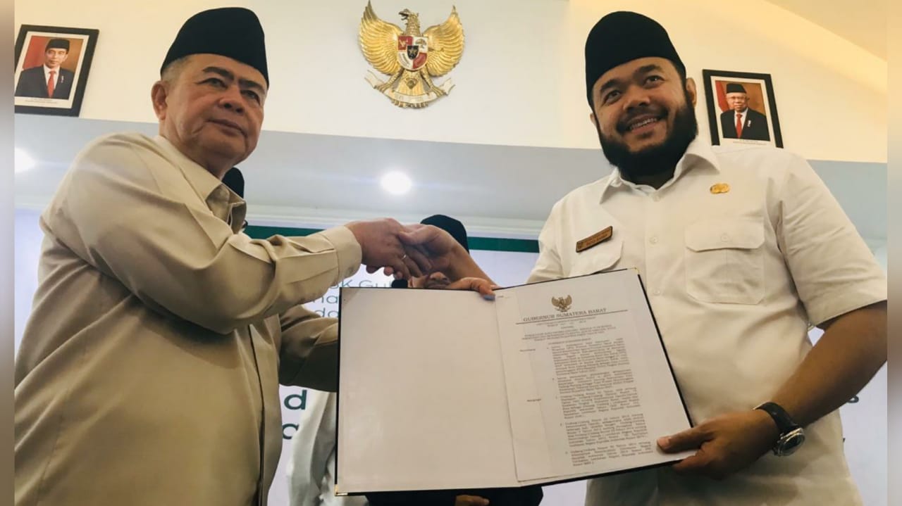 Wakil Gubernur Nasrul Abit langsung menyerahkan SK tersebut dan diterima Wali Kota Padang Panjang, Fadly Amran, di Padangpanjang, Rabu (22/1/2020)