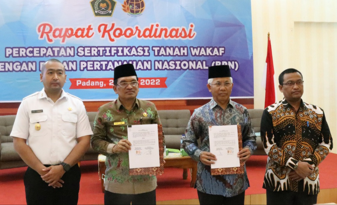 Sedangkan Kakanwil ATR BPN menyatakan kesiapan dalam menjalankan MoU percepatan sertifikasi tanah wakaf di Sumbar dan Ia meminta kerjasama jajaran Kemenag Sumbar untuk segera melengkapi dokumen administrasi sebagai syarat percepatan sertifikasi tanah wakaf.