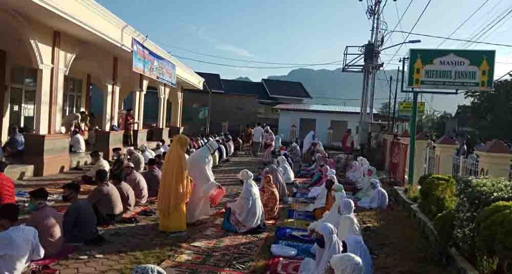 Seperti di kawasan Balai Baru Padang, salat Idul Fitri digelar di halaman Masjid Miftahul Jannah dengan protokol Covid-19.