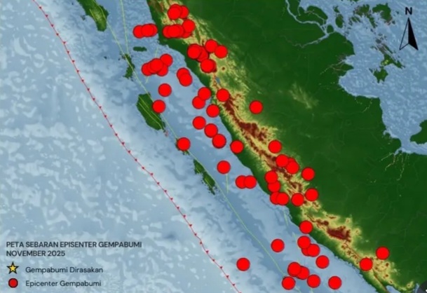 “Peta sebaran episenter menunjukkan aktivitas ini dipicu oleh subduksi Lempeng Samudera Hindia-Eurasia serta pergerakan Sesar Sumatra di daratan,” tulis BMKG Padang Panjang di laman Instagramnya, Senin (1/12/2025).