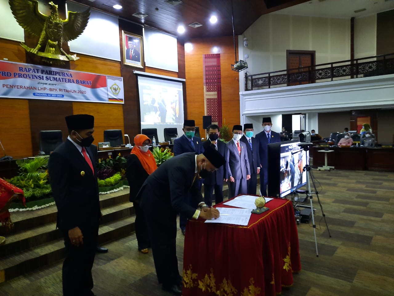 Laporan Hasil Pemeriksaan (LHP) atas laporan keuangan itu diserahkan oleh Badan Pemeriksa Keuangan (BPK) RI Perwakilan Sumbar saat rapat paripurna di Ruang Sidang Utama Dewan Perwakilan Rakyat Daerah (DPRD) Sumbar, Jumat (7/5/2021).