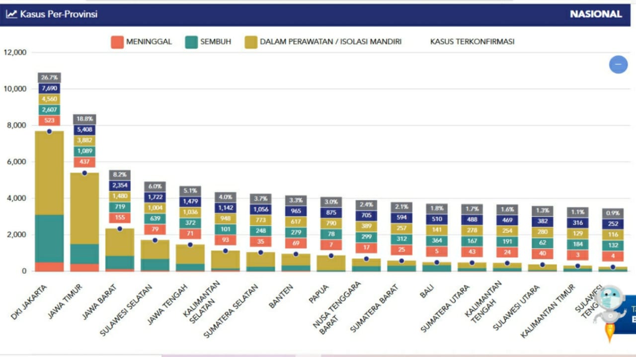 Berdasar data Gugus tugas nasional covid-19.go.id pada Sabtu (6/6/2020) pagi, DKI Jakarta masih terbanyak dengan total 7.690 kasus positif. Disusul Jawa Timur 5.408 kasus, Jawa Barat 2.354 kasus, Sulawesi Selatan 1.722 kasus dan Jawa Tengah 1.479 kasus. Kemudian, Kalimantan Selatan 1.142 kasus, Sumatra Selatan 1.056 kasus, Banten 965 kasus dan Nusa Tenggara Barat 705 kasus. Sumbar berada di nomor 11, di bawah NTB.