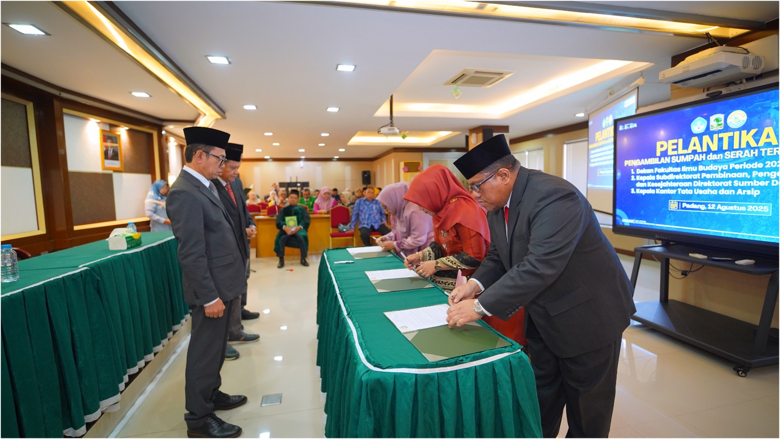 Langgam.id – Universitas Andalas (UNAND) menggelar Pelantikan, Pengambilan Sumpah, dan Serah Terima Jabatan pejabat baru di Ruang Rapat Senat, Kampus Limau Manis, Selasa (12/8/2025).