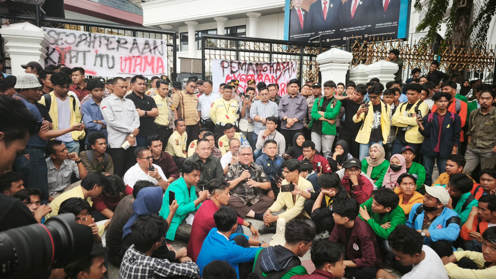 Langgam.id – Ketua DPRD Sumbar Muhidi menemui massa aksi yang tergabung ke dalam Aliansi Badan Eksekutif Mahasiswa (BEM) Sumatera Barat (SB) di halaman kantor DPRD Sumbar. Selain menemui massa aksi, Muhidi juga menandatangani dan menerima semua tuntutan yang diajukan.