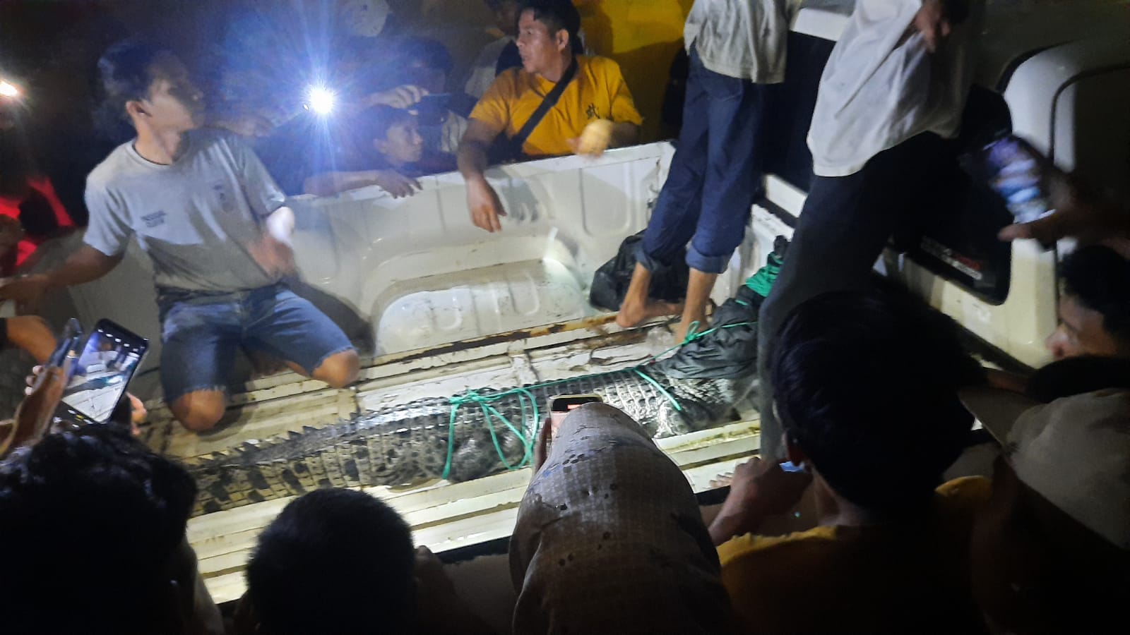 Petugas sejak kemunculan buaya telah berusaha menangkap, namun hewan buas itu kabur beberapa kali. Meski demikian, hewan itu tidak jauh dari lokasi. Hingga tengah malam penangkapan dibantu puluhan warga dan ditonton oleh ratusan warga lainnya.