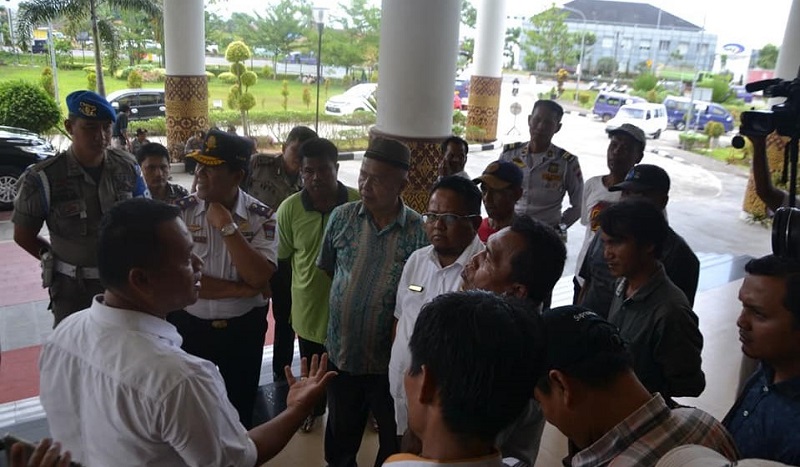 Kepala Dinas Perhubungan (Dishub) Kota Padang Dian Fakri beserta jajaran hadir menanggapi unjuk rasa itu di pelataran lobi Kantor Balai Kota Aie Pacah.