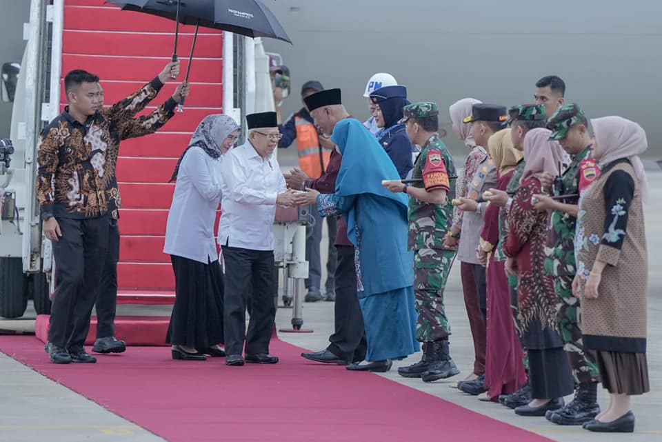 Kedatangan Ma’ruf di Ranah Minang disambut leh Gubernur Sumbar Mahyeldi Ansharullah di VIP Room Bandara Internasional Minangkabau (BIM).