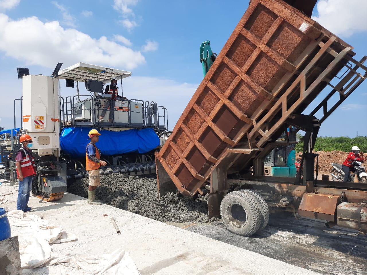 Ada bagian lain yang juga telah dibeton namun terpisah dari titik awal. Proyek tersebut dikerjakan secara terputus-putus. Sejumlah pekerja juga tampak merangkai besi berbagai kerangka untuk jalan tol. Selain itu, truk mengangkut tanah untuk pengerasan jalan dan truk pengangkut semen beton juga masih beroperasi.