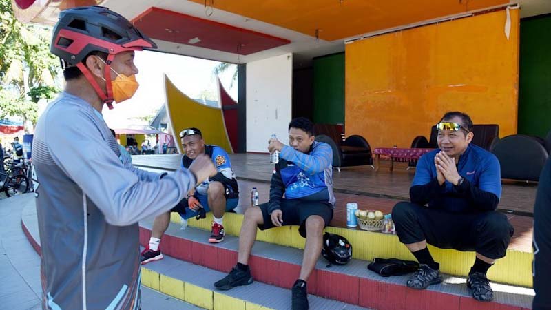 Rombongan Kapolda disambut oeh Wali Kota Pariaman Genius Umar di batas kota, jembatan Sunur, Kecamatan Pariaman Selatan dan ikut “gowes” sampai ke Pantai Gandoriah.
