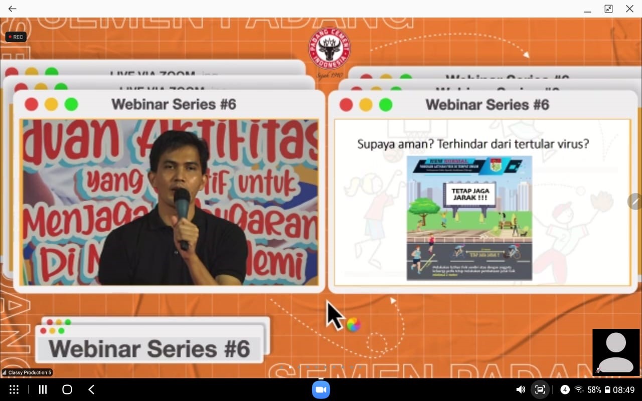 Webinar Series #6 yang digelar secara virtual oleh perusahaan semen pertama di Indonesia dan Asia Tenggara itu, diawali dengan senam bersama yang dimulai pada pukul 07.30 WIB hingga pukul 8.30 WIB, dan senam tersebut dipandu oleh Ellen’s Gym.