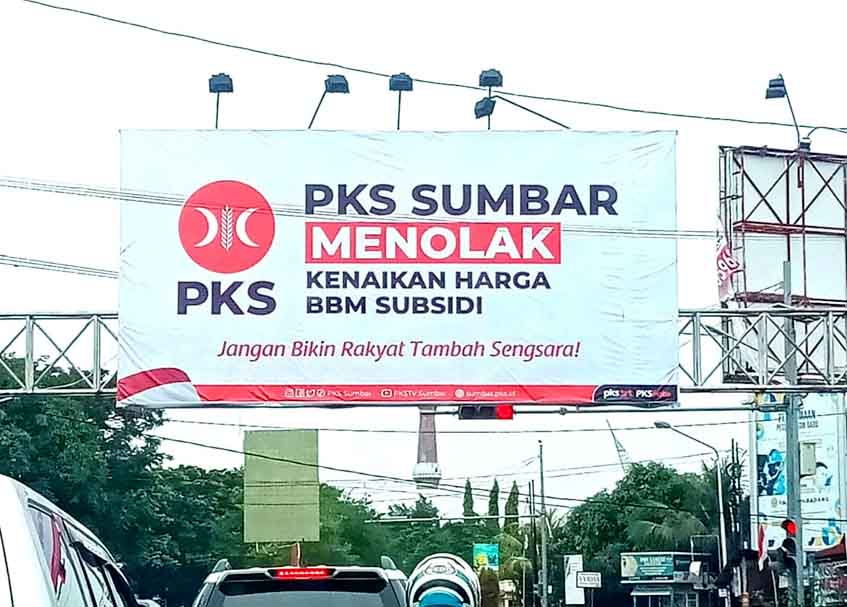 Dalam baliho itu dituliskan “PKS Sumbar menolak kenaikan harga BBM subsidi, jangan bikin rakyat tambah sengsara,” tertulis di baliho tersebut.