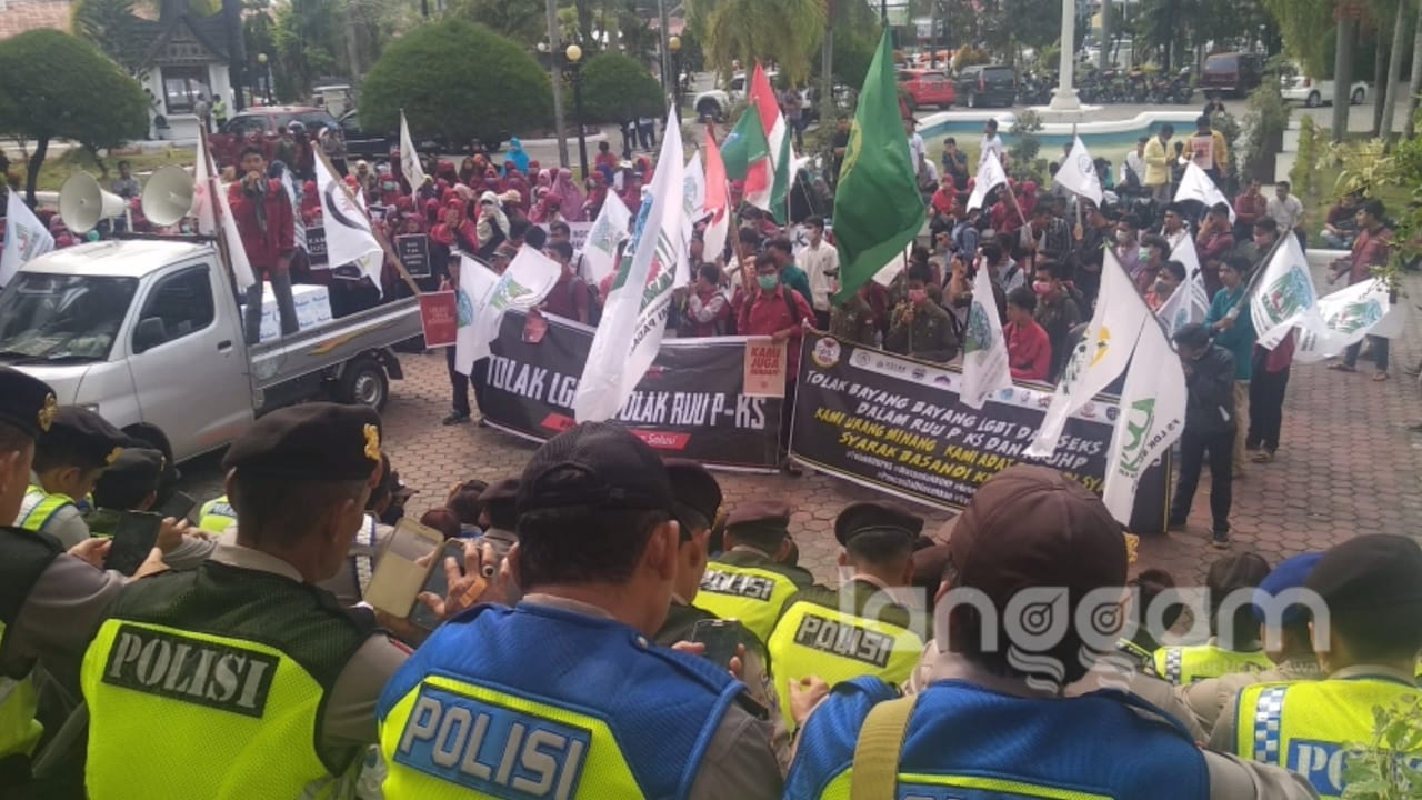 Massa yang mengatasnamakan Aliansi Masyarakat Peduli Umat (AMPU) Sumbar itu, menolak pengesahan Rancangan Undang-undang tentang Penghapusan Kekerasan Seksual (RUU PKS).