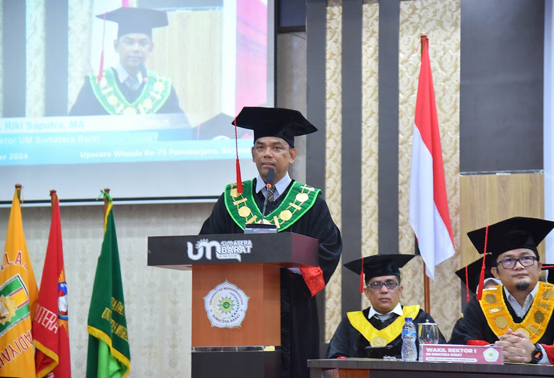 Rektor UM Sumatera Barat, Dr. Riki Saputra, M.A dalam sambutannya menyampaikan, wisuda UM Sumatera Barat kali ini menjadi saksi dari hasil kerja keras, dedikasi, pengorbanan wisudawan-wisudawati yang selama ini telah menempa diri melalui perjalanan panjang, sarat dengan proses pencarian makna hingga proses untuk mendapatkan pencerahan.