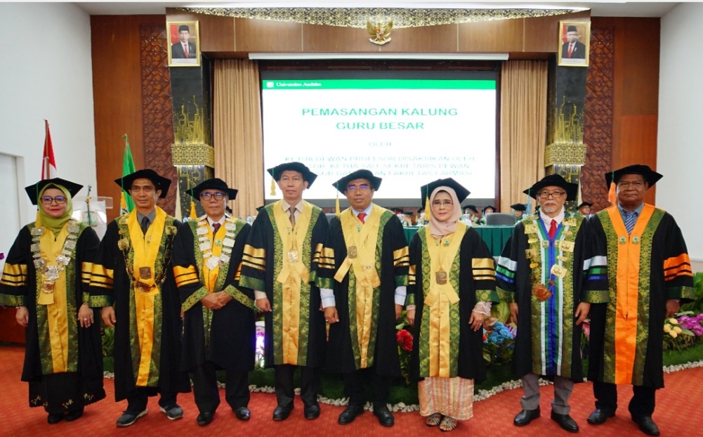 Ketiga guru besar baru yang dikukuhkan tersebut adalah Prof. Dr. Apt. Erizal Zaini, S.Si, M.Si pada bidang Farmasetika, Prof. Dr. apt. Yufri Aldi, M.Si bidang Farmakologi, dan Prof. Dr. apt. Elidahanum Husni, M.Si bidang Farmakognosi.