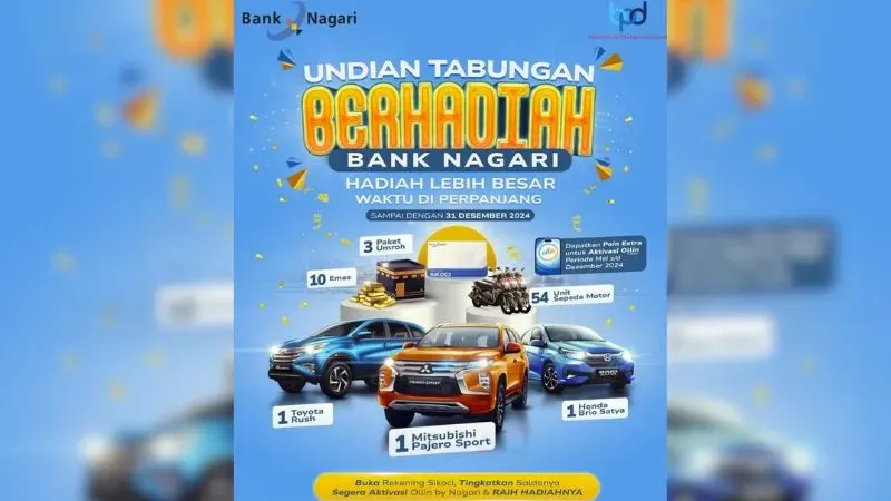 Manajemen Bank Nagari menyediakan hadiah-hadiah utama seperti mobil Mitsubishi Pajero Sport, Toyota Rush, Honda Brio, sepeda motor, emas, hingga hadiah umrah.
