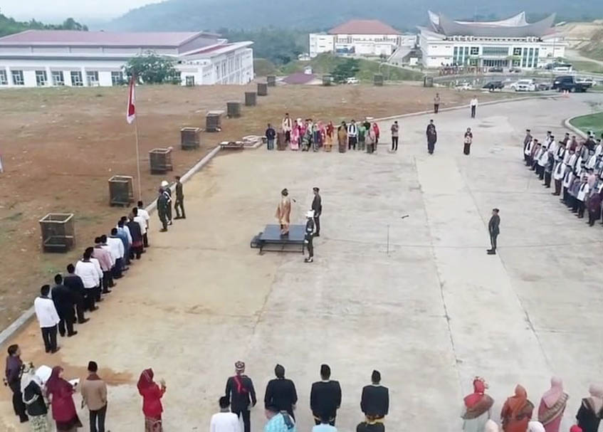 Upacara perdana ini menghadirkan momen khidmat saat bendera merah-putih dikibarkan sambil diperdengarkan lagu kebangsaan Indonesia Raya.