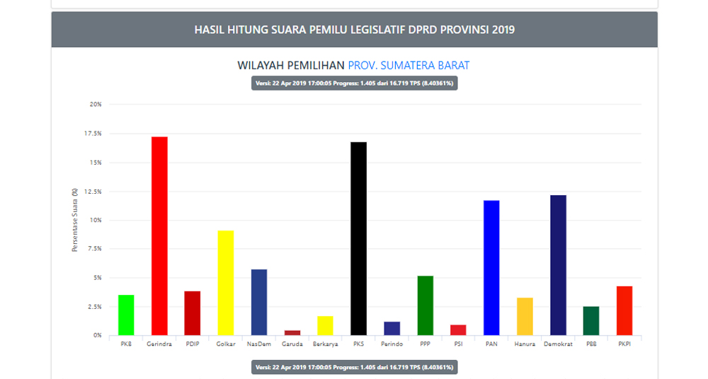 Berdasarkan situs resmi https://pemilu2019.kpu.go.id/#/dprri/hitung-suara/, suara real count yang masuk baru 8,4 persen atau1.405 dari 16.719 total Tempat Pemungutan Suara (TPS) di Sumatera Barat.