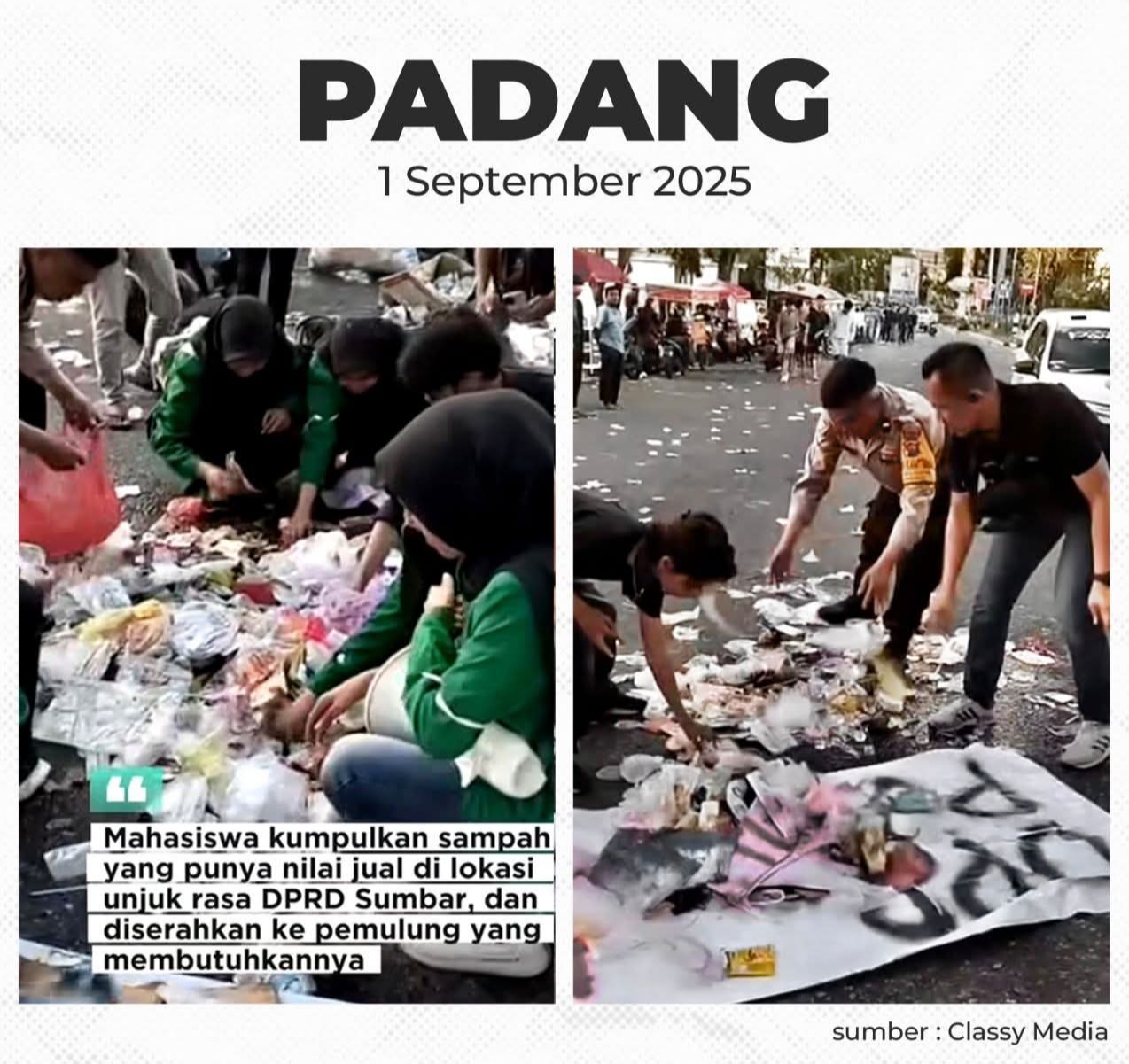 Sampah yang berserakan dipungut. Sampah itu ditampung dengan spanduk yang sebelumnya dibentangkan saat unjuk rasa. Aksi mahasiswa ini mendapat respon positif dari banyak orang.