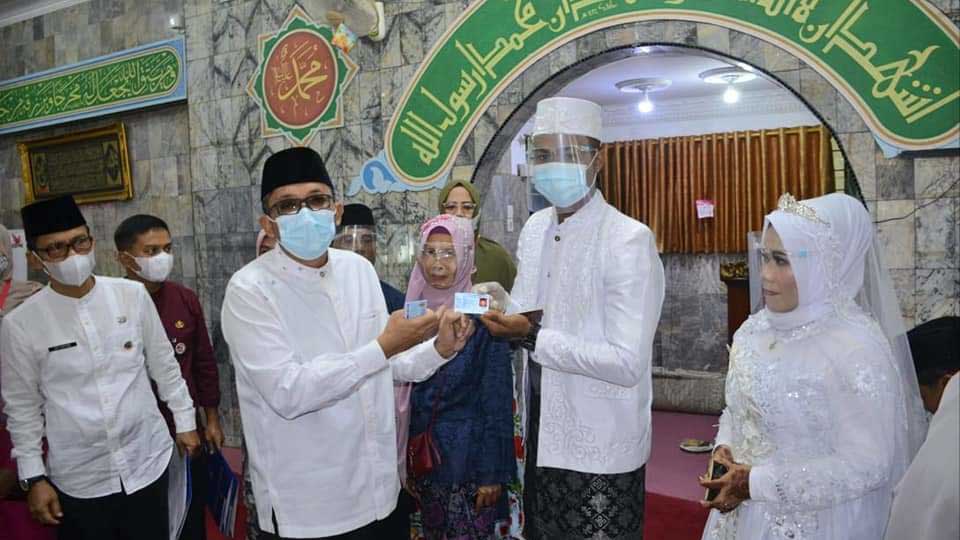 Wali Kota Padang Hendri Septa menyerahkan dokumen kependudukan sebagai bagian dari "Sikado" kepada pasangan pengantin setelah menikah. (Foto: Humas Pemko Padang)